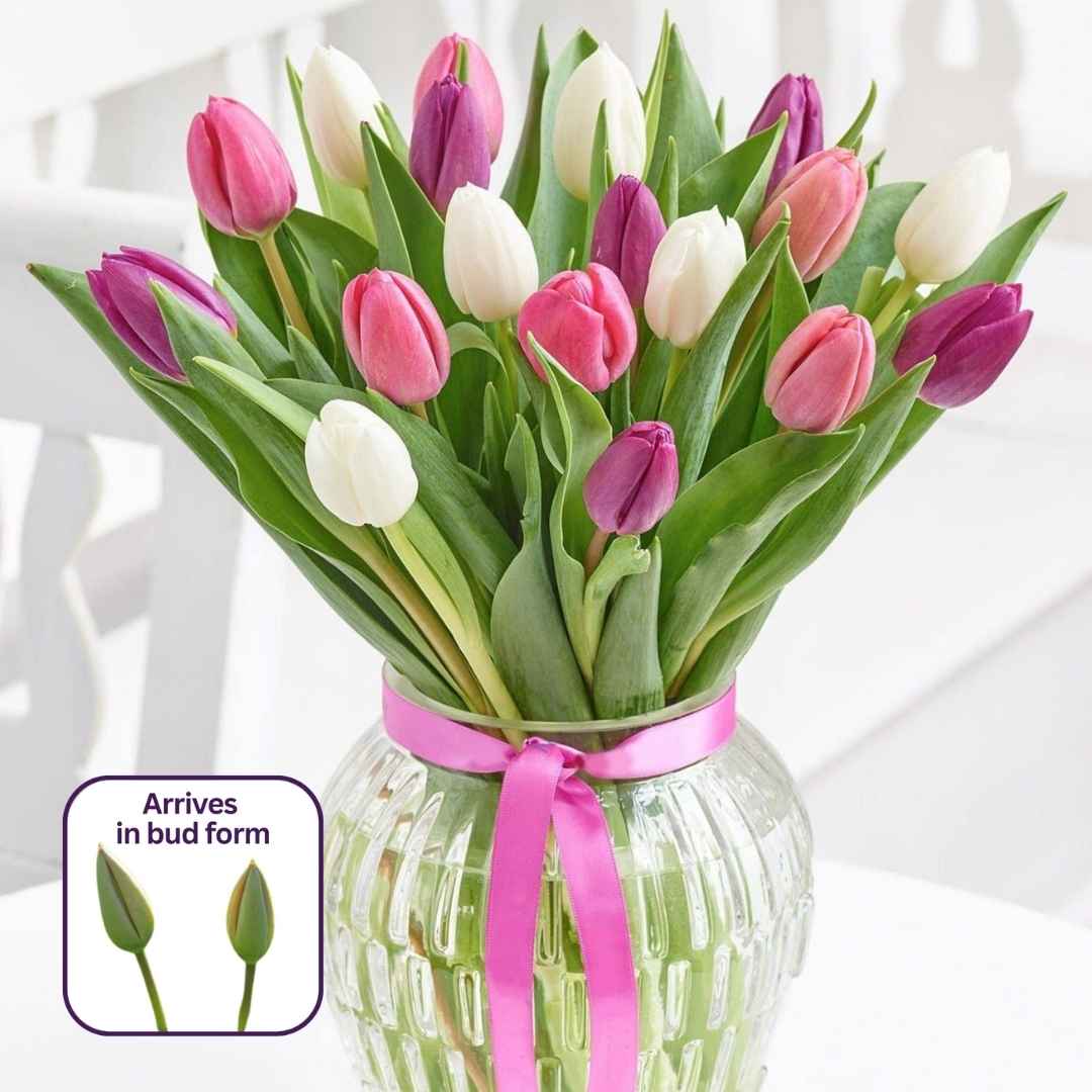 Each tulip is a burst of colour and cheer, creating a delightful symphony that's sure to bring a smile to anyone's face. The combination of playful hues adds a touch of fun and liveliness to this lovely arrangement, making it a perfect choice for brightening up special moments and creating a vibrant atmosphere.