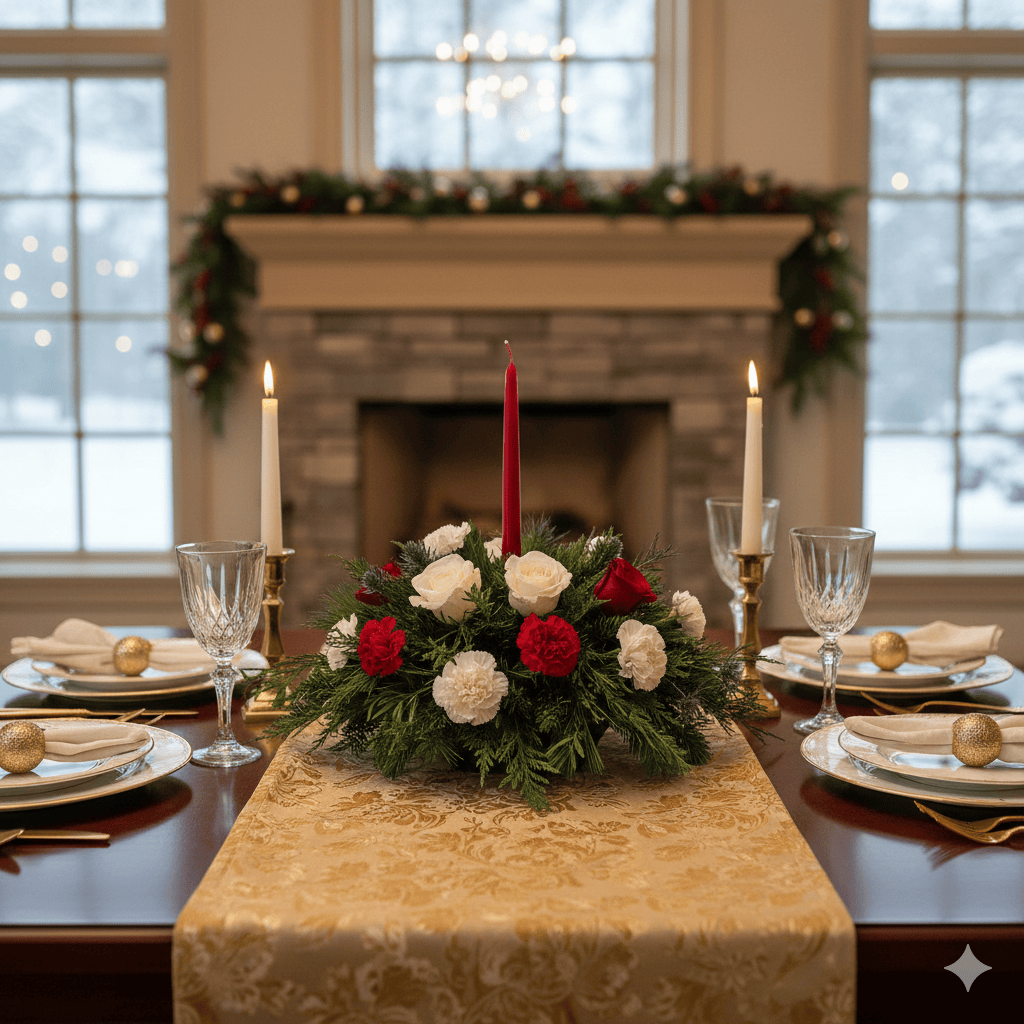 Designed to adorn a festive table or a home with seasonal charm. Created with a mix of roses, carnations, thistle, pine cones, and festive foliage, this centrepiece is the perfect complement to your holiday decor.