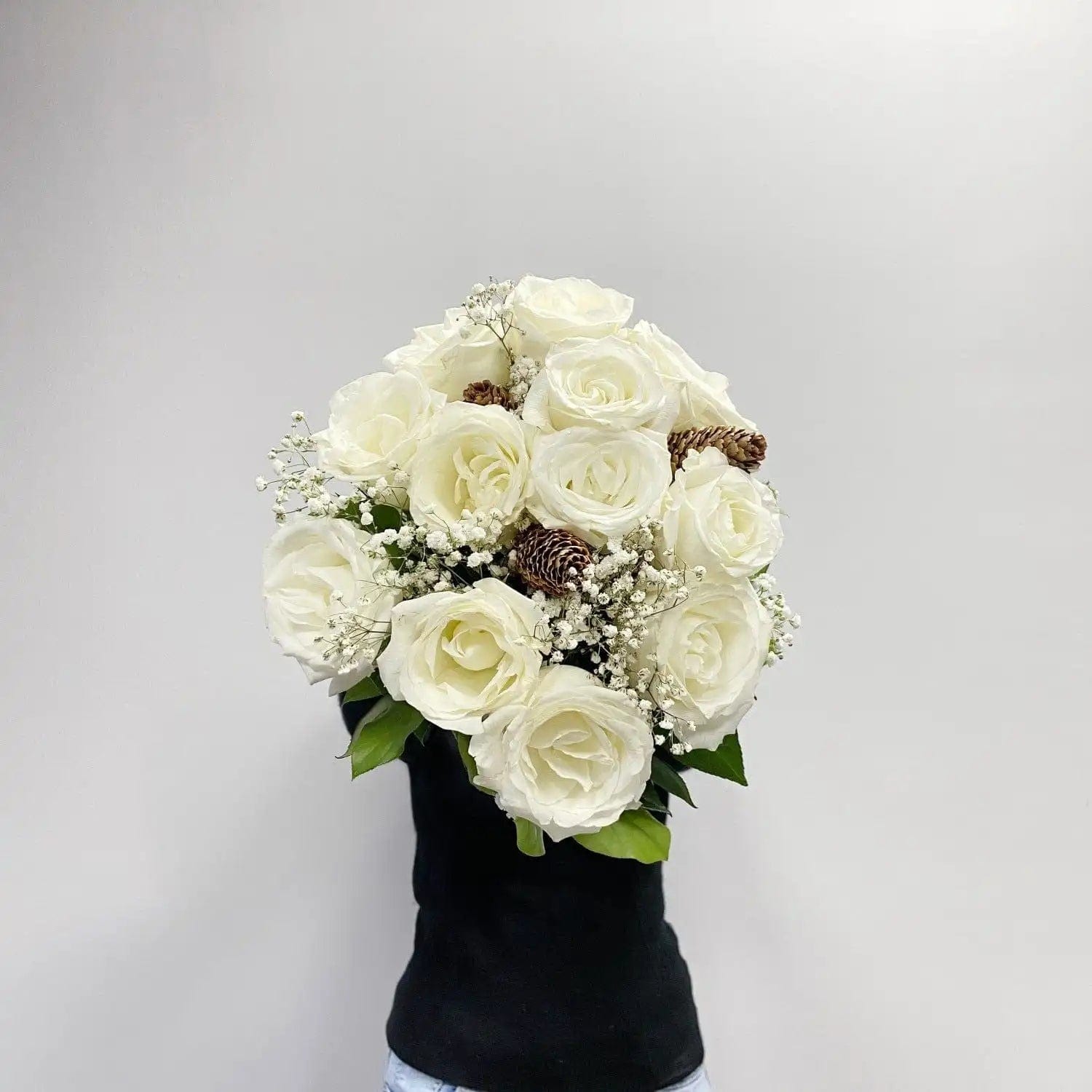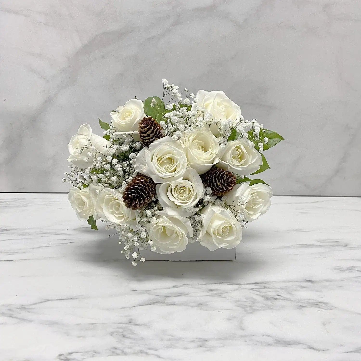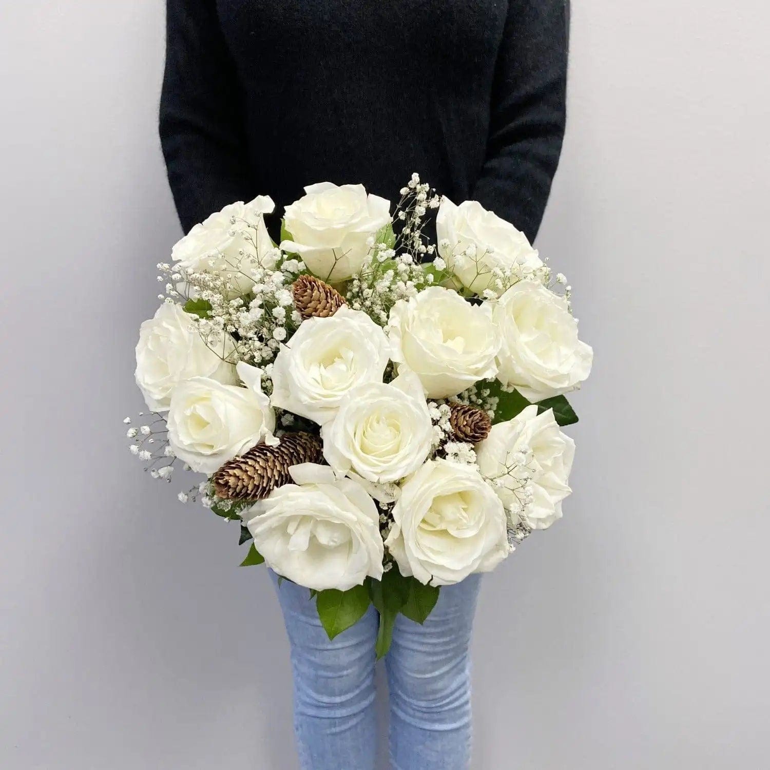 A radiant bouquet that captures the essence of the holiday season. Features 12 exquisite white roses, delicately accented with babies breath and adorned with the rustic charm of pine cones. The classic beauty and elegance of white roses go beyond mere flowers; they become a heartfelt expression of love, affection.