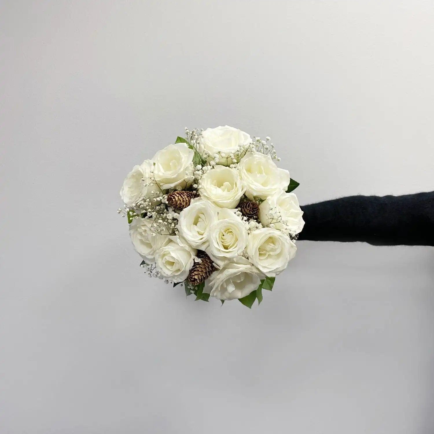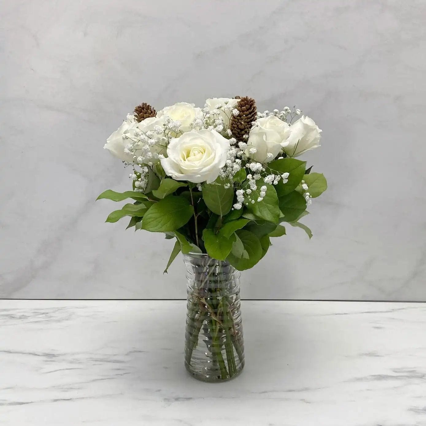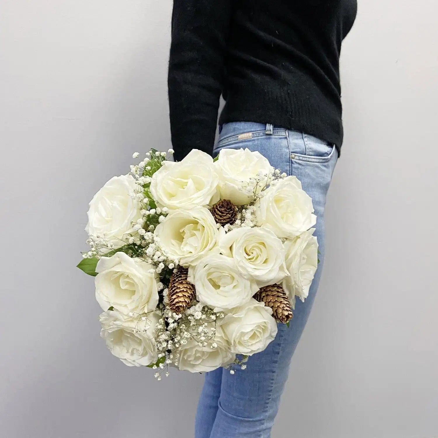 A radiant bouquet that captures the essence of the holiday season. Features 12 exquisite white roses, delicately accented with babies breath and adorned with the rustic charm of pine cones. The classic beauty and elegance of white roses go beyond mere flowers; they become a heartfelt expression of love, affection.