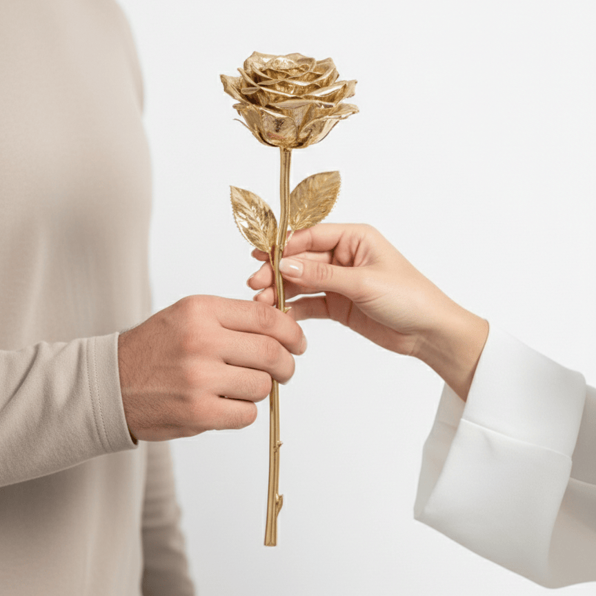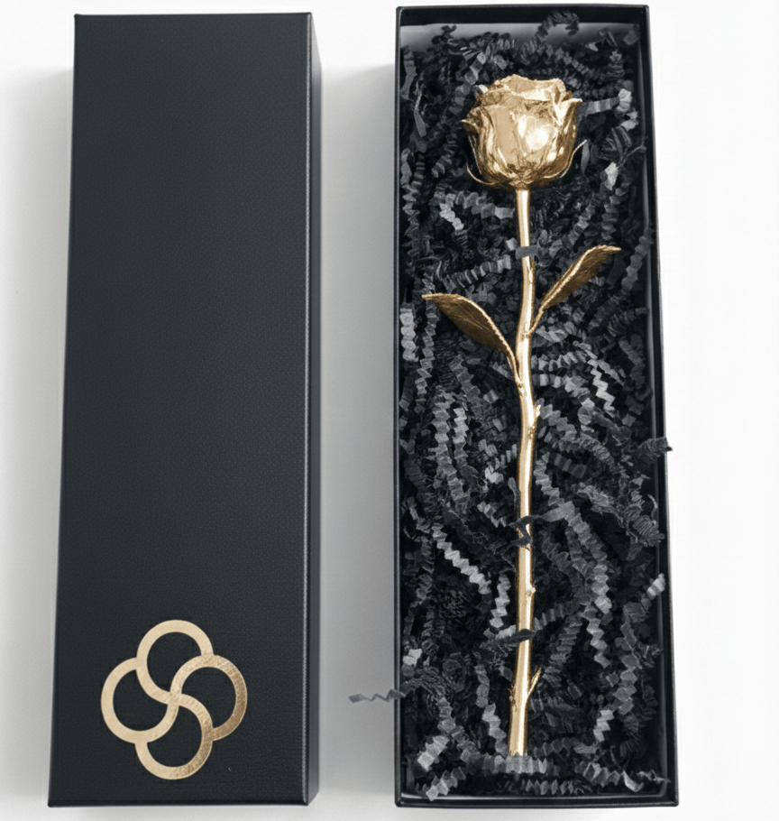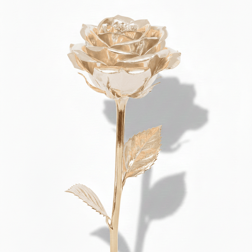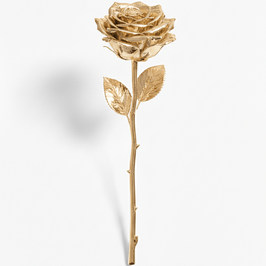 Give a gift that never fades. This stunning Eternal Gold Rose is a masterpiece of craftsmanship, designed to capture the delicate beauty of a real flower in a permanent, luxurious form. Each petal and leaf is meticulously plated finished to reflect light with a soft, sophisticated glow, making it a timeless symbol of love and appreciation.