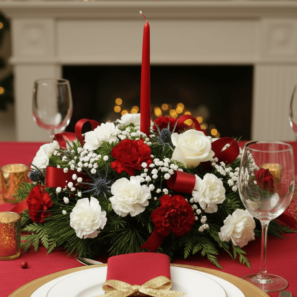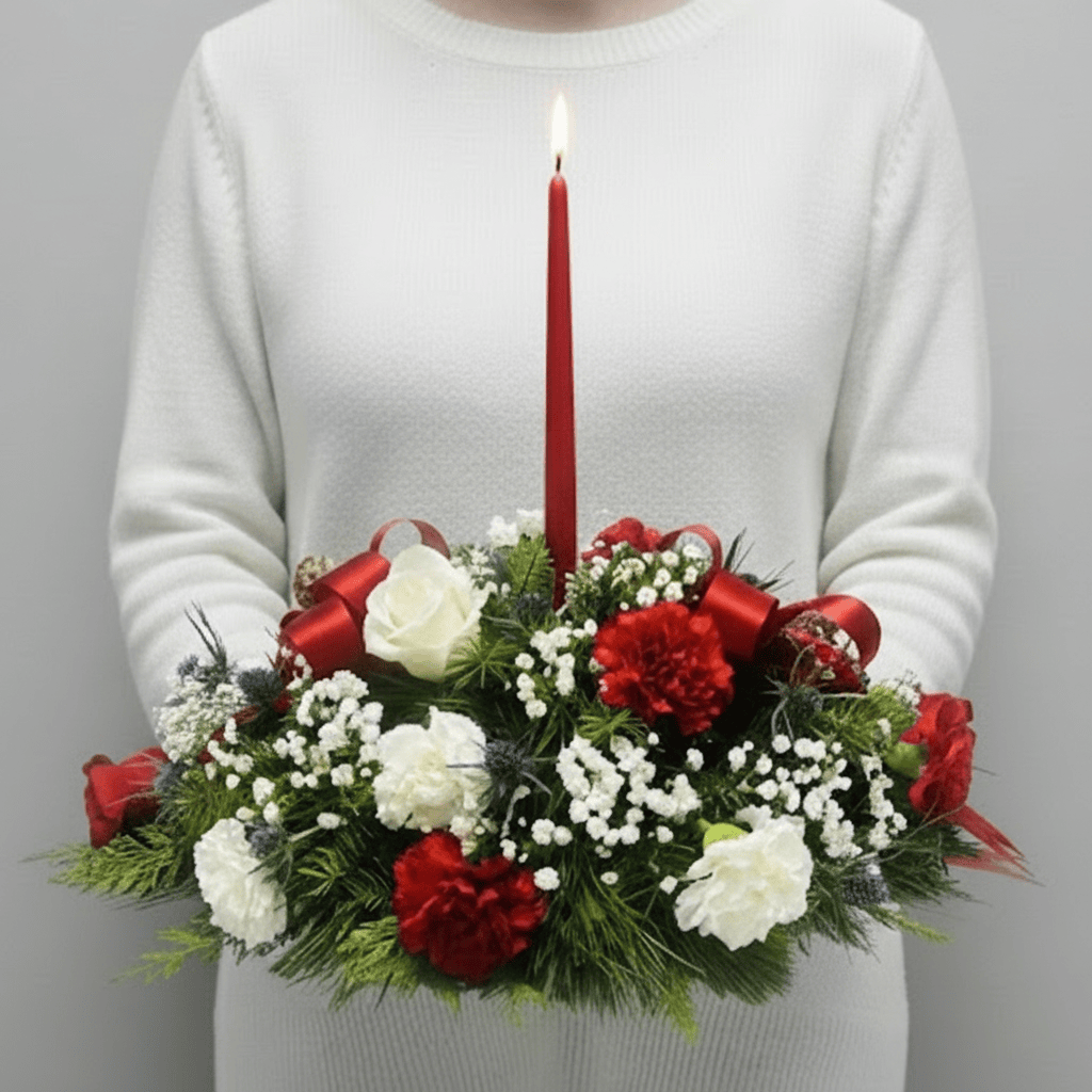 Designed to adorn a festive table or a home with seasonal charm. Created with a mix of roses, carnations, thistle, pine cones, and festive foliage, this centrepiece is the perfect complement to your holiday decor.