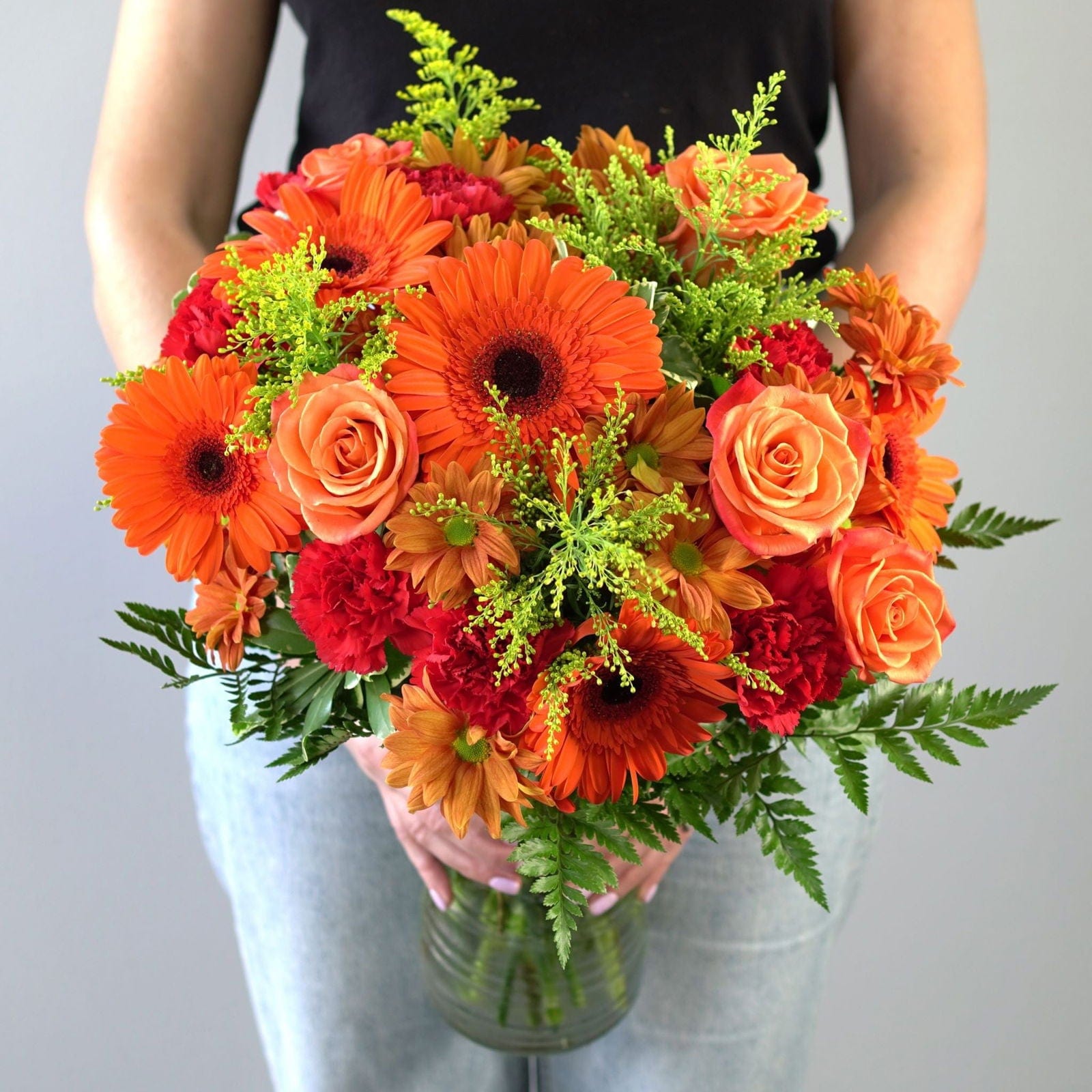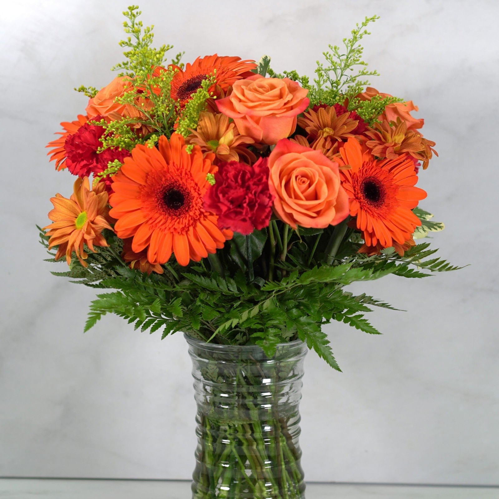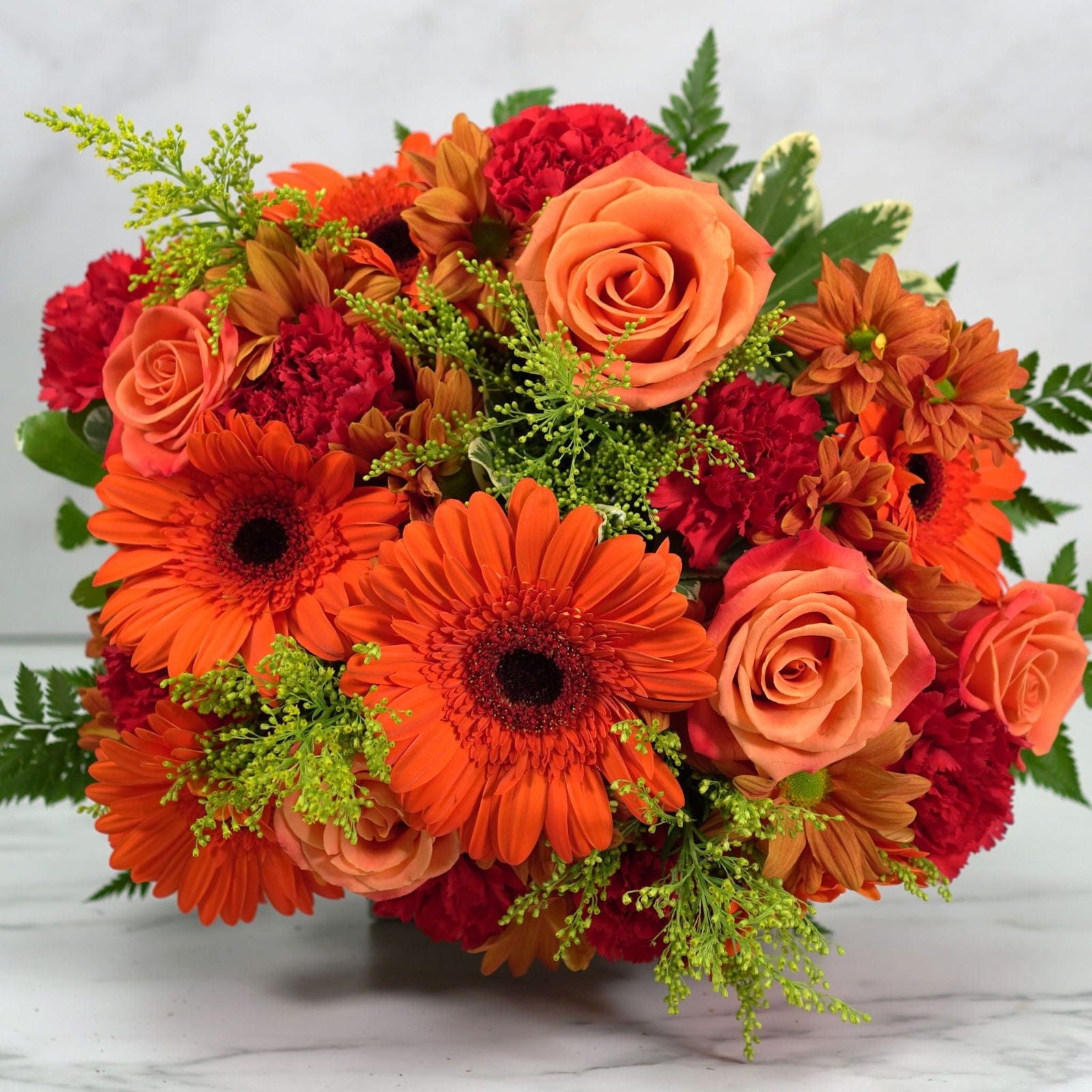 A beautiful arrangement that celebrates the richness of the harvest season. Crafted with a medley of orange roses, gerberas, red carnations, daisies, and accented with pitt and salal foliage, this bouquet is a perfect accent to the vibrant colours of fall.