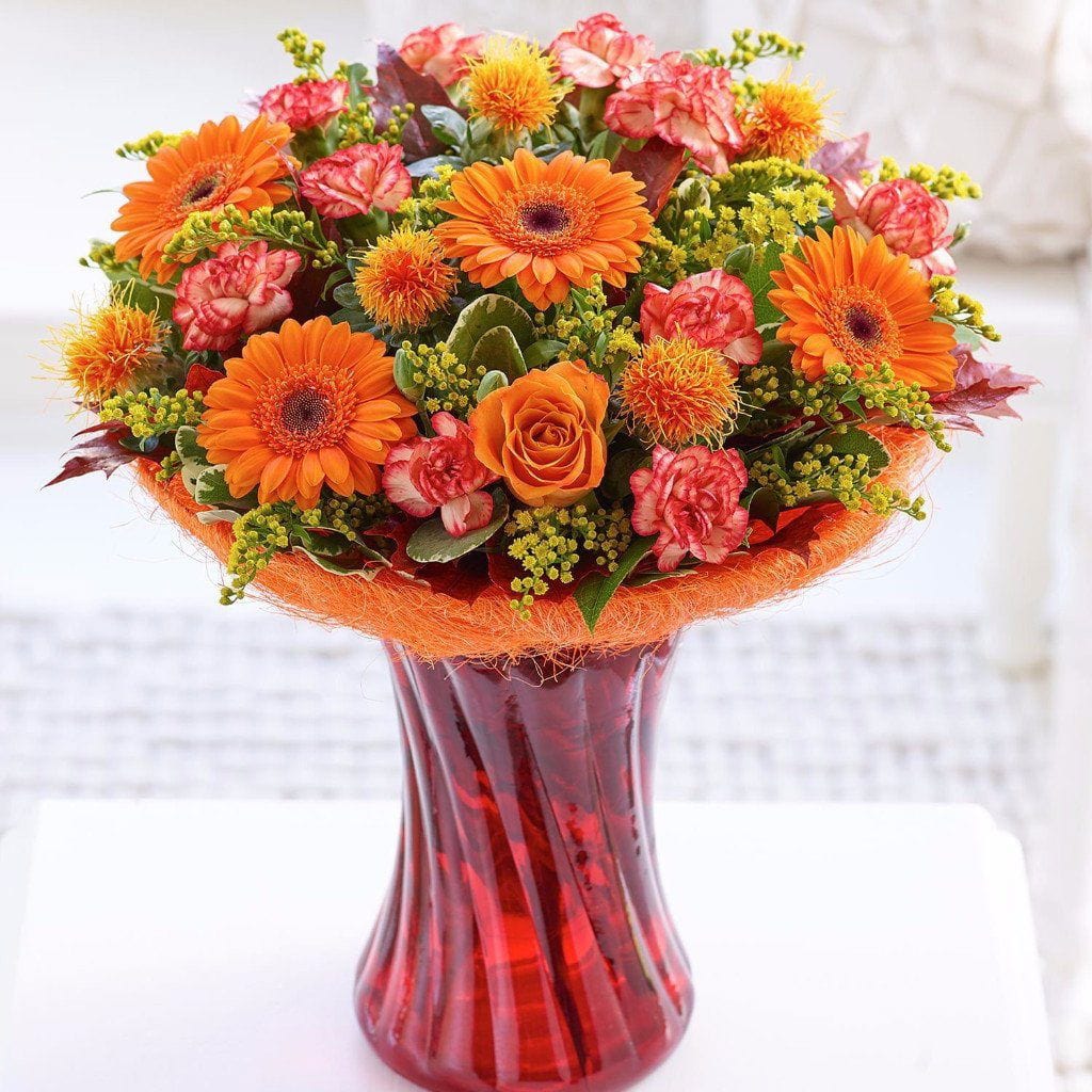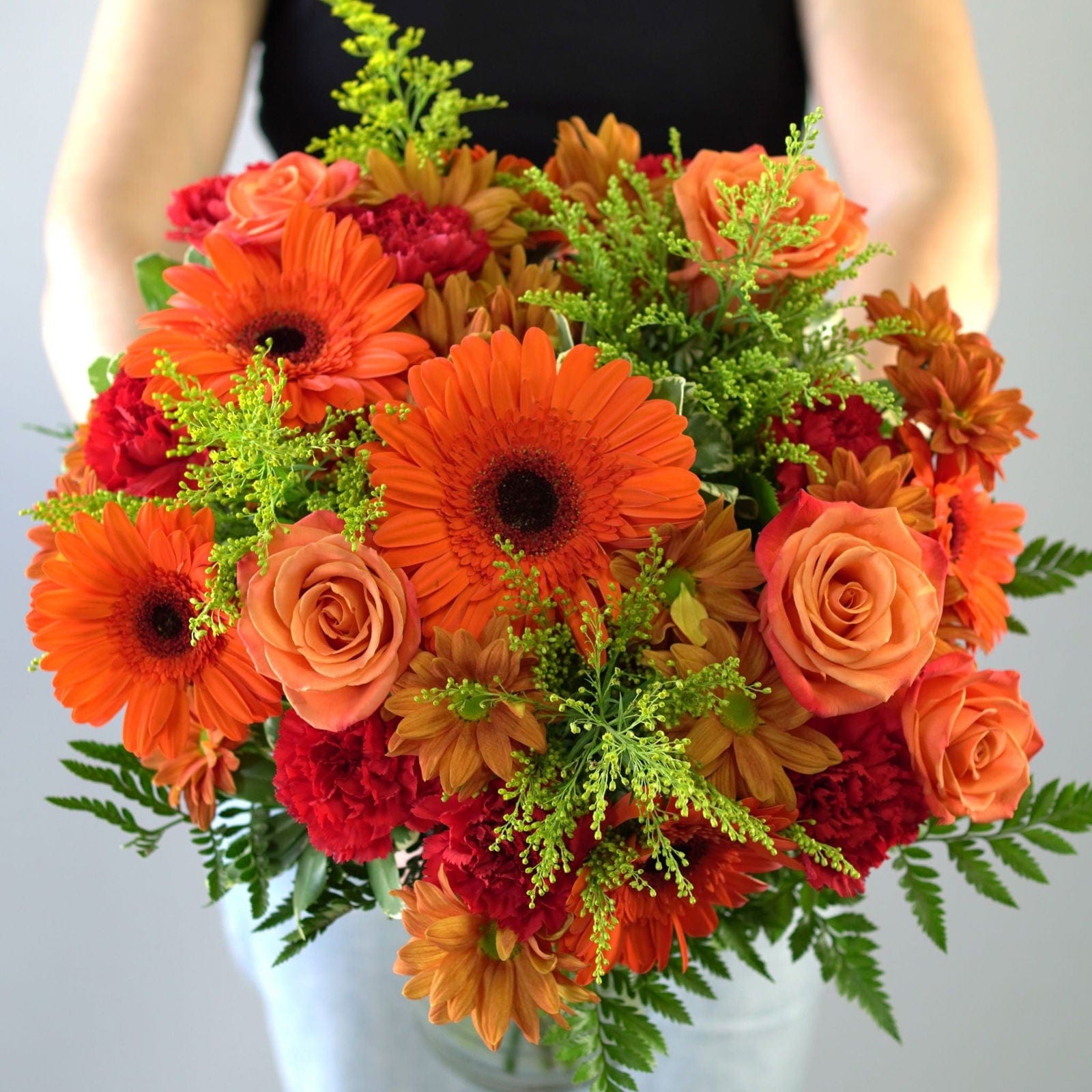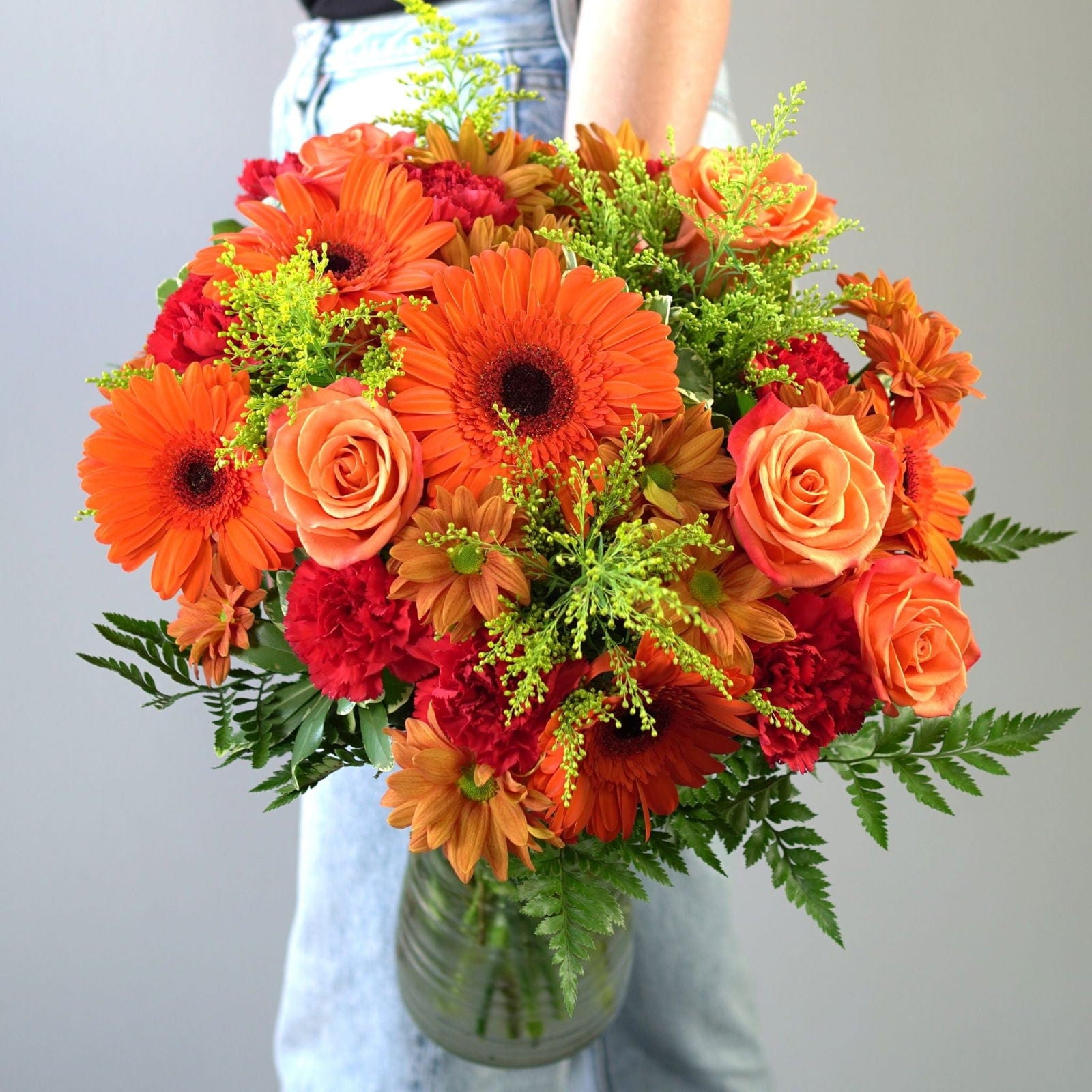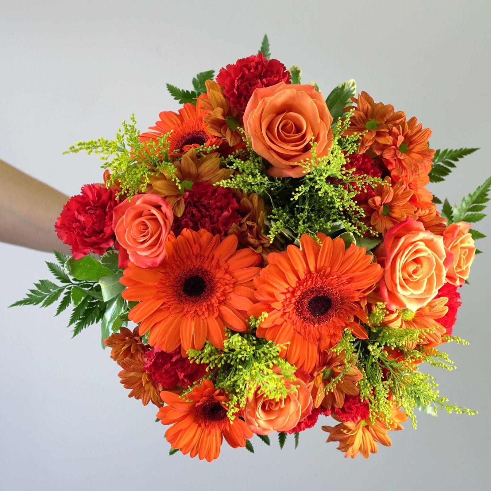 A beautiful arrangement that celebrates the richness of the harvest season. Crafted with a medley of orange roses, gerberas, red carnations, daisies, and accented with pitt and salal foliage, this bouquet is a perfect accent to the vibrant colours of fall.